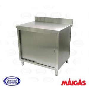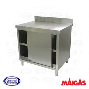 - Este mesón de trabajo es una solución práctica y funcional para cocinas comerciales, panaderías y negocios gastronómicos. Su diseño compacto incluye un bandejero integrado que optimiza el espacio y facilita la organización.