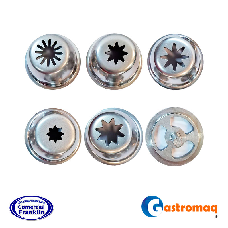 - Este set incluye 6 piezas diseñadas especialmente para máquinas rellenadoras de churros. Cada boquilla cuenta con una forma distinta, lo que permite elaborar churros variados y atractivos, ideales para sorprender a tus clientes con diferentes presentaciones.