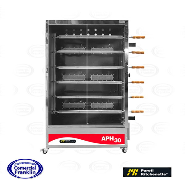 El modelo APH 30 de Pareti-Kitchenette® permite cocinar 30 piezas de pollo, donde cada manilla asadora logra cocinar 5 piezas de pollo sin ningún problema. Haciendo de este modelo un producto práctico y fácil de usar.