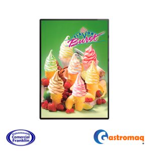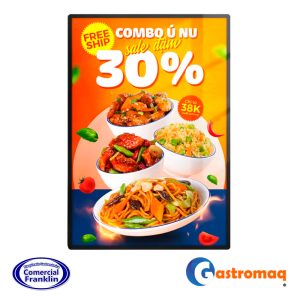 - Panel publicitario ultra delgado (Slim Light Box) diseñado para montaje en pared o estructuras fijas. Utiliza tecnología de retroiluminación LED de alta eficiencia para resaltar menús y gráficos promocionales con un brillo uniforme y vibrante. Su diseño elegante y minimalista lo hace perfecto para integrarse en la decoración moderna de locales comerciales sin ocupar espacio de tránsito.