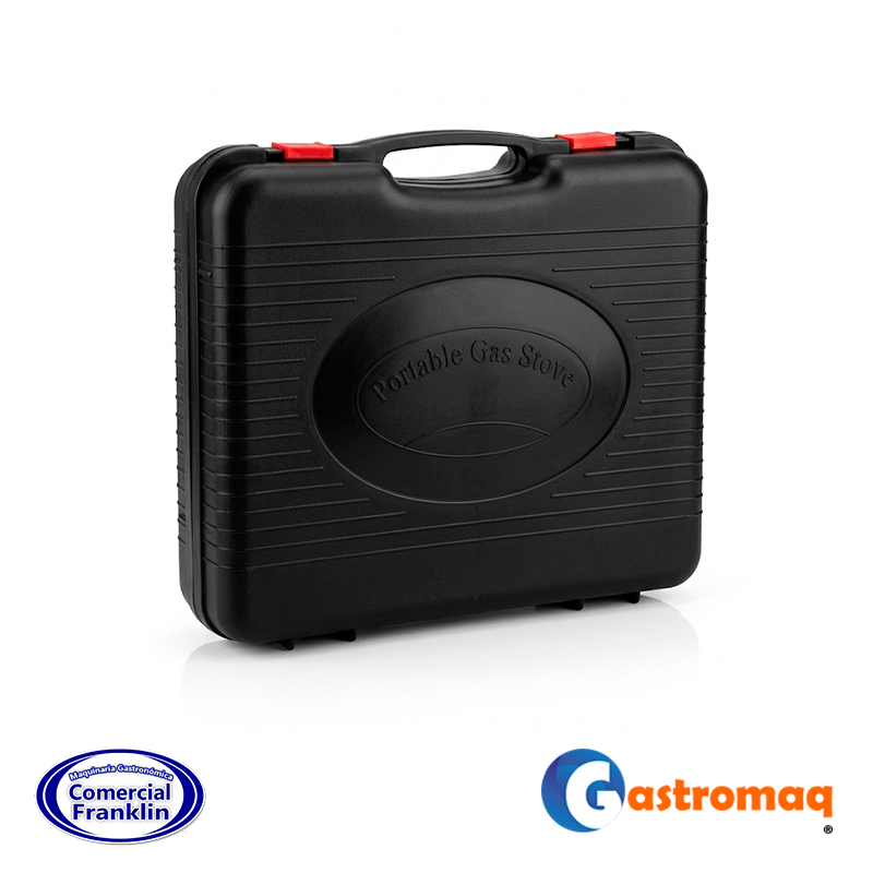 - Cocina portátil de un quemador tipo maleta, diseñada para funcionamiento con cartuchos de gas butano.