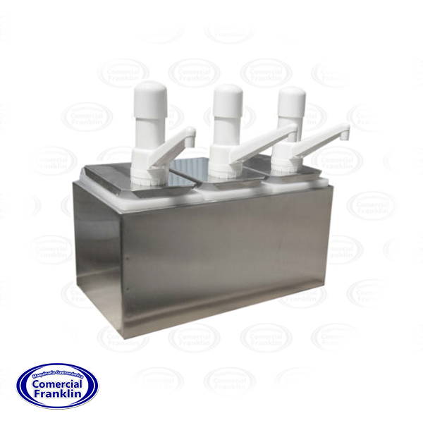 - Dispensador Salsa Acero 3 Depósitos 6 lts. Toppo Gastromaq, ideal para puntos de venta con alto flujo de clientes. Permite centralizar los tres aderezos principales en una sola unidad compacta y robusta. Su sistema de triple bombeo manual garantiza una higiene superior al evitar el contacto directo del usuario con el producto o el recipiente original.