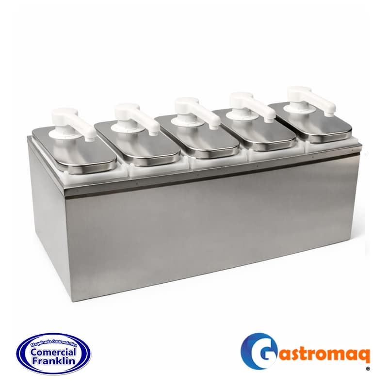 - Usos: Indispensable en estaciones de aderezos para autoservicio, barras de panchos (hot dogs), hamburgueserías y buffets. Ideal para productos que requieren refrigeración externa y luego se colocan en el dispensador.