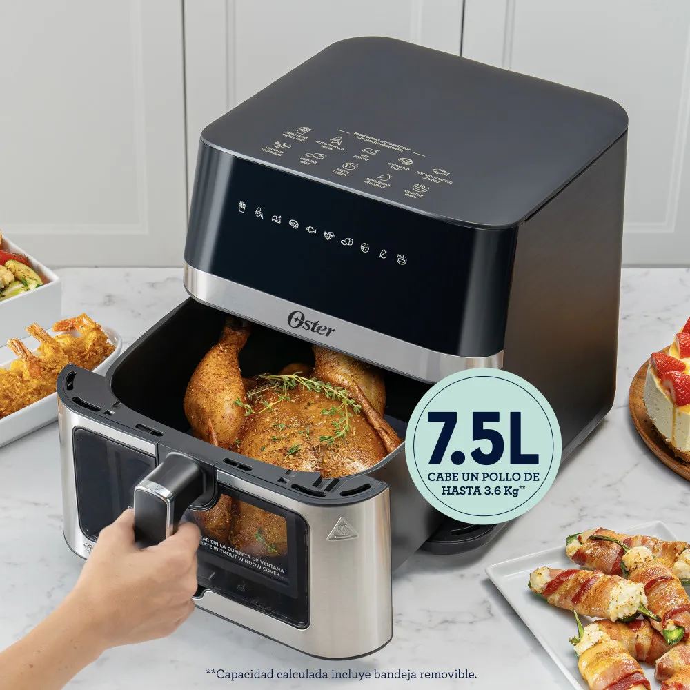 - Su capacidad de 7.5L** permite cocinar un pollo de hasta 3.63Kg.