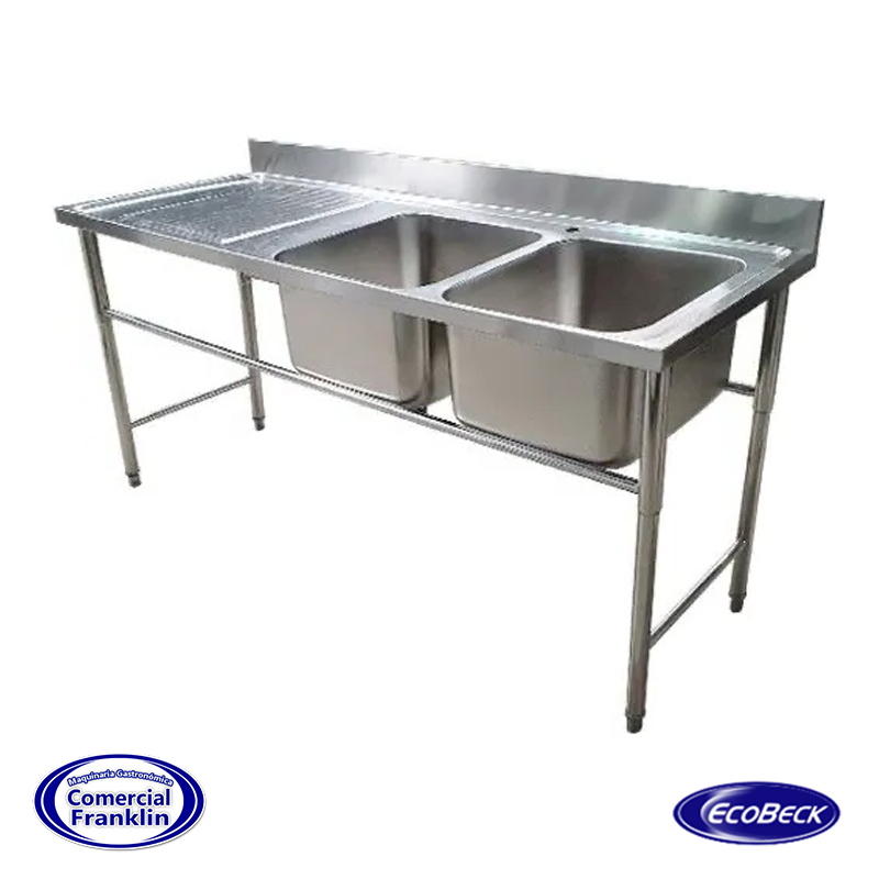 - Optimiza la limpieza en tu cocina profesional con este lavafondos de acero inoxidable. Cuenta con dos recipientes espaciosos que facilitan el lavado simultáneo de utensilios y alimentos. Incorpora secador en el lado izquierdo, ideal para escurrir vajilla o preparar ingredientes con mayor eficiencia. Su diseño robusto y dimensiones de 145x60x90 cm lo convierten en una solución resistente y funcional para restaurantes, casinos o fábricas de alimentos.