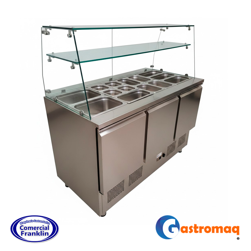 Mesón Saladette 14 Depósitos 3 Puertas Cúpula Vidrio+Repisa Gastromaq
