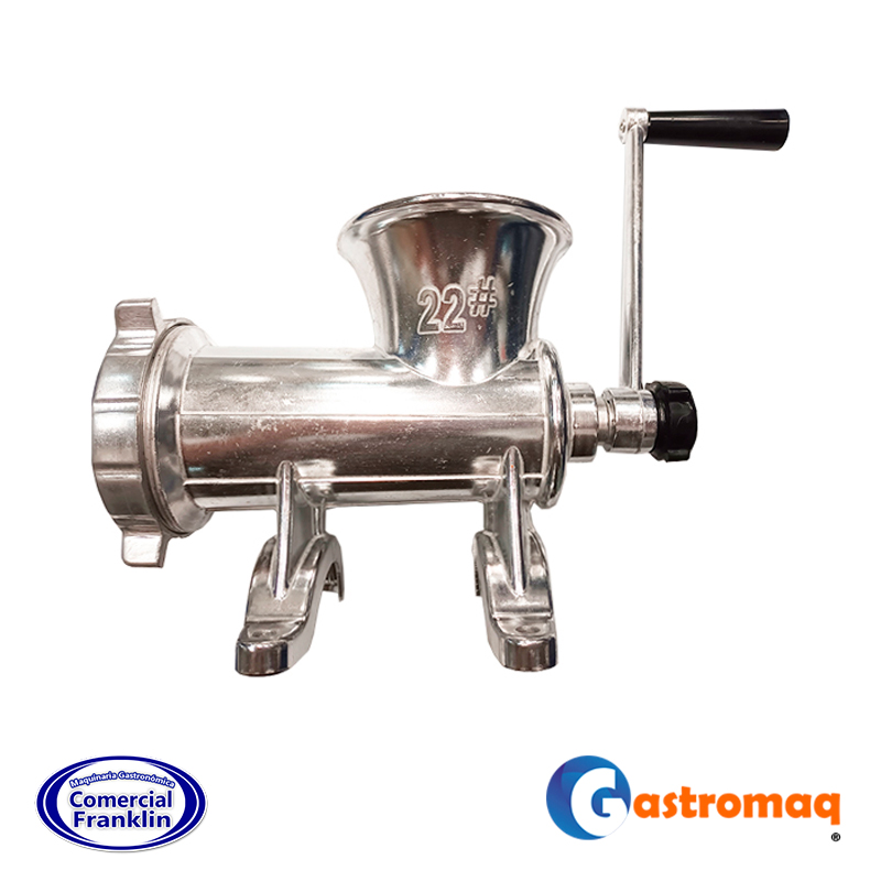 - Moledora de carne manual N° 22, robusta y de gran durabilidad, diseñada para moler carne de forma eficiente en establecimientos gastronómicos y carnicerías.