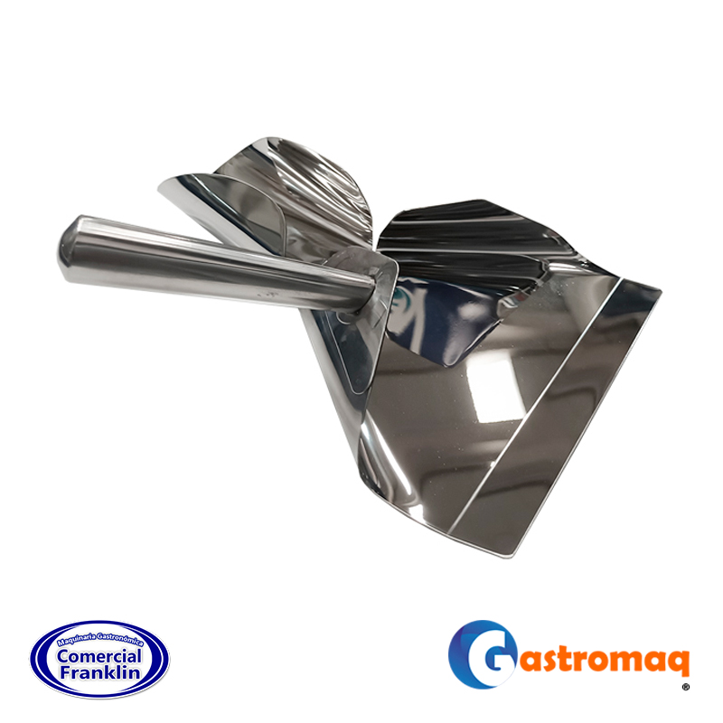 - Poruña para papa frita con mango de acero inoxidable, diseñada para servir porciones de papas fritas de manera rápida y precisa en cocinas comerciales y restaurantes.