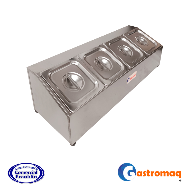 - Su diseño compacto y estable permite una disposición eficiente de ingredientes, facilitando el acceso y mejorando la productividad en cocinas profesionales, estaciones de servicio o buffets.